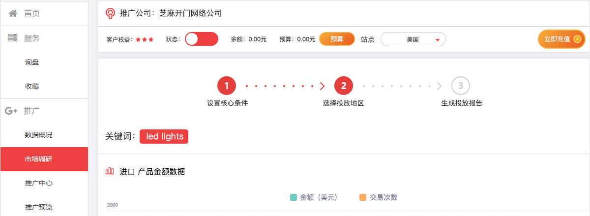 后臺直接充值即可進行谷歌投放,內置關鍵詞工具、推廣中心、推廣預覽、消費明細等,直接操作,不需要再去進行谷歌開戶等操作。